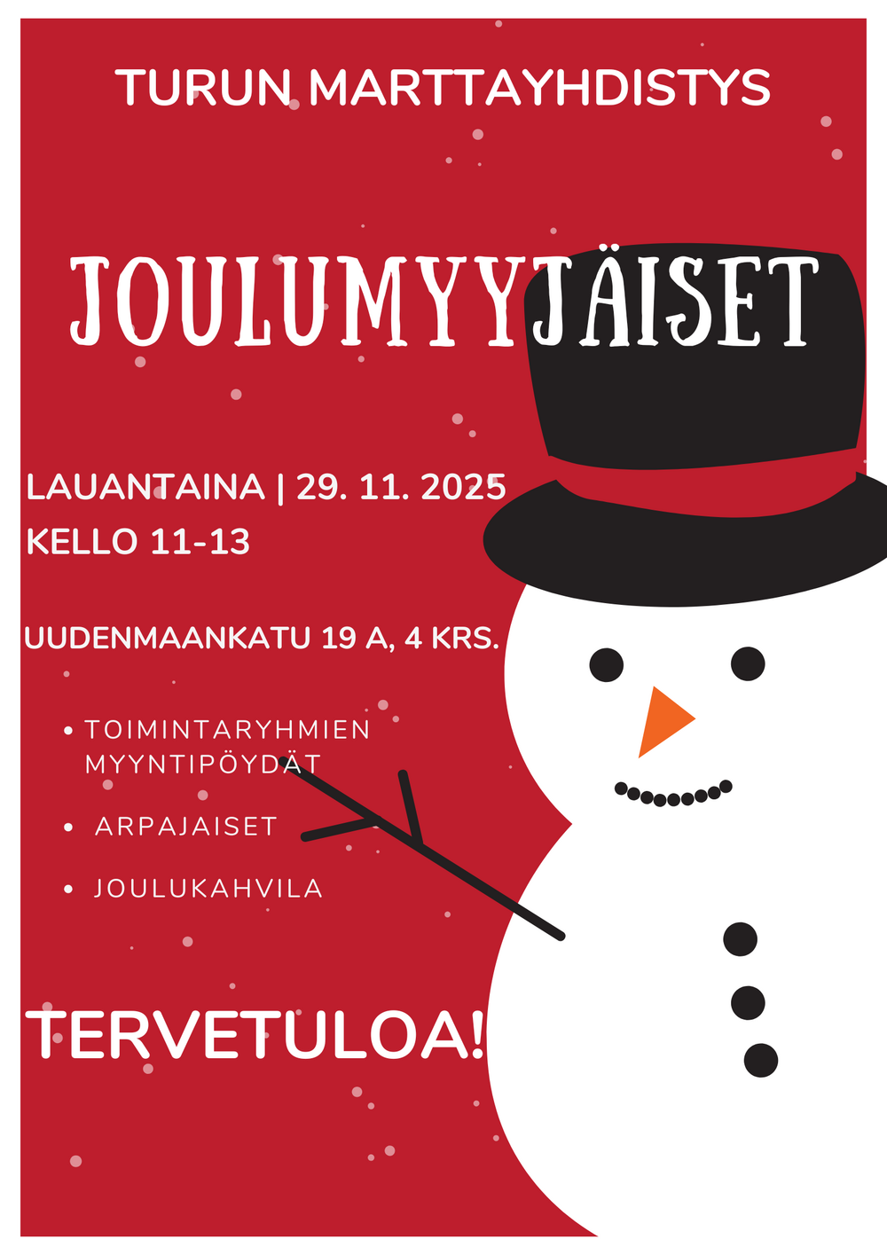 Tervetuloa Turun Marttayhdistyksen joulumyyjäisiin! Toimintaryhmiemme myyntipöydät notkuvat jouluherkkuja, käsitöitä ja muuta mukavaa jouluista tavaraa. Lisäksi arpajaiset ja jouluinen kahvila.